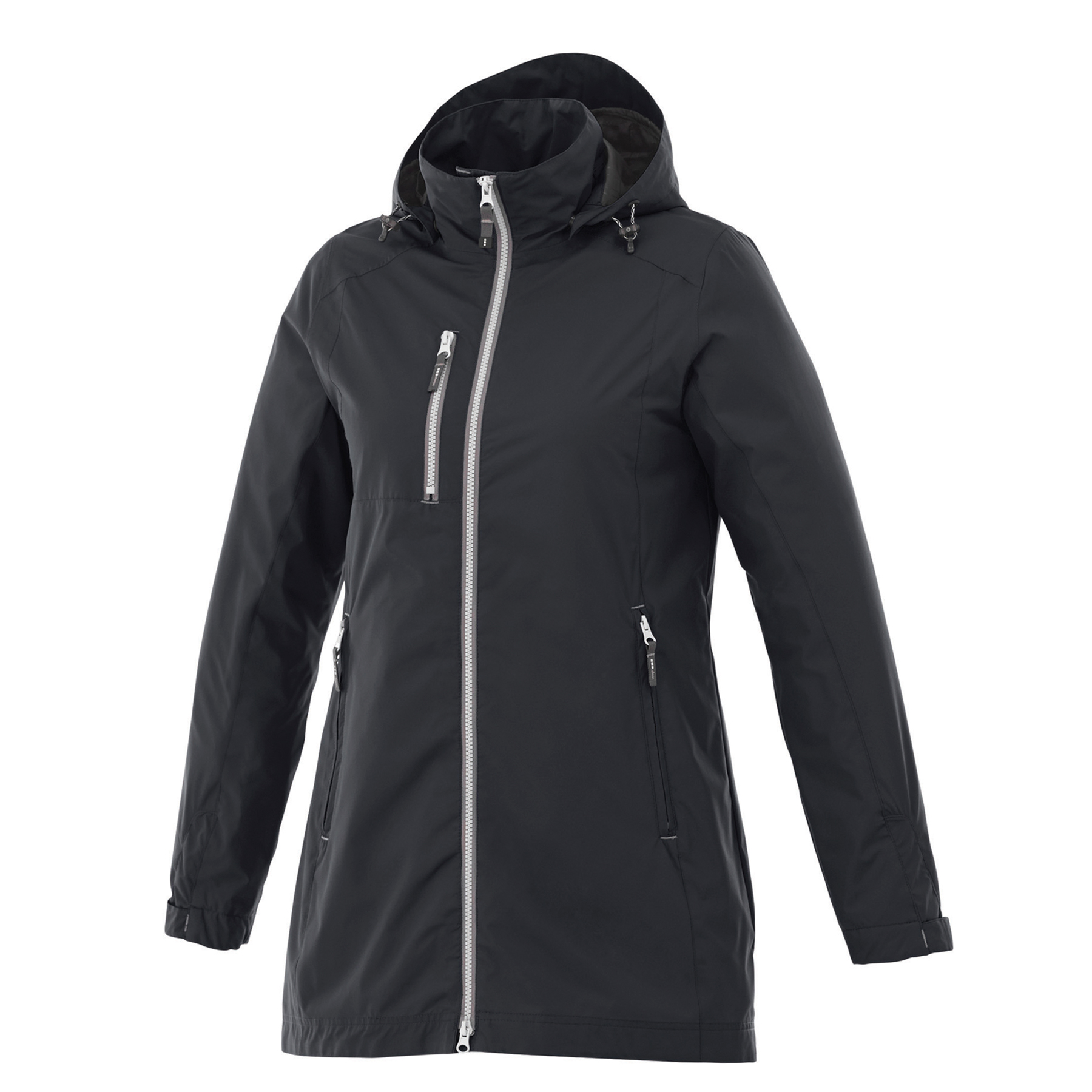 This modernized rain jacket is sleek in design, critically seam sealed with a waterproof, breathable coating and water repellent finish.